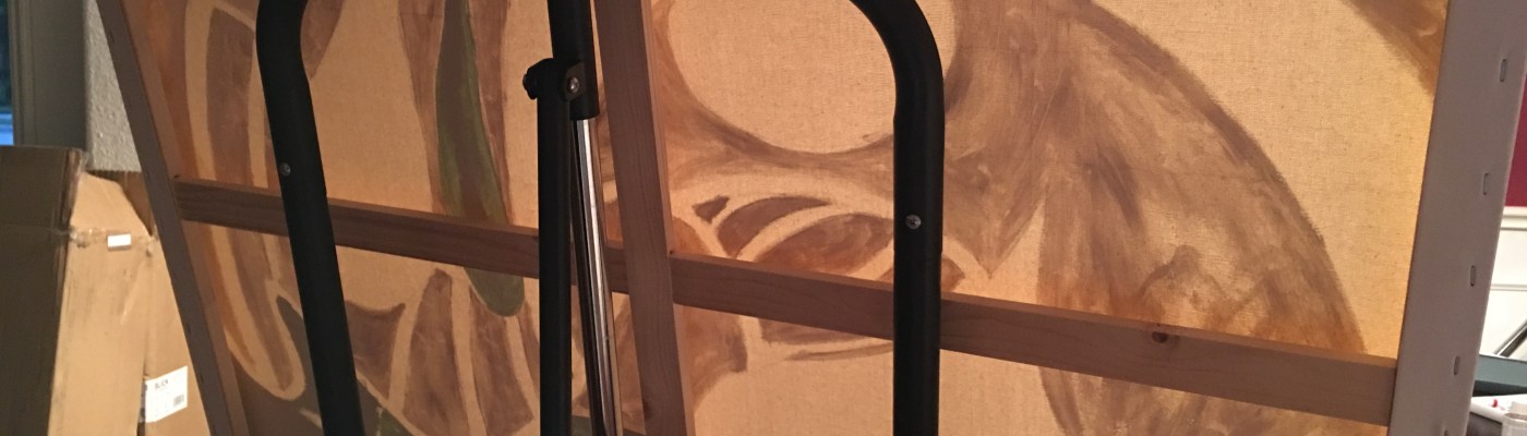 I worked on this one for a while, working the background first and I ran out of the main color. I ordered some more, and pushed the easel aside to clear the walkway through the dining room where it was set up. I headed to the kitchen to wash my brushes and when I came back I saw the (barely begun) painting from behind. And I loved it. I thought – wouldn’t it be great if I could hang it that way, specifying that there be light behind it so you can see the twisty curves and open spaces. Ego that I have, I would have assumed that I would like the painting best from the front – seeing the picture (I am an abstract artist to begin with, but still!). Then it occurred to me that I know our Gallery rules and there is really not much chance of my being allowed to hang it “backwards.” That just isn’t done.