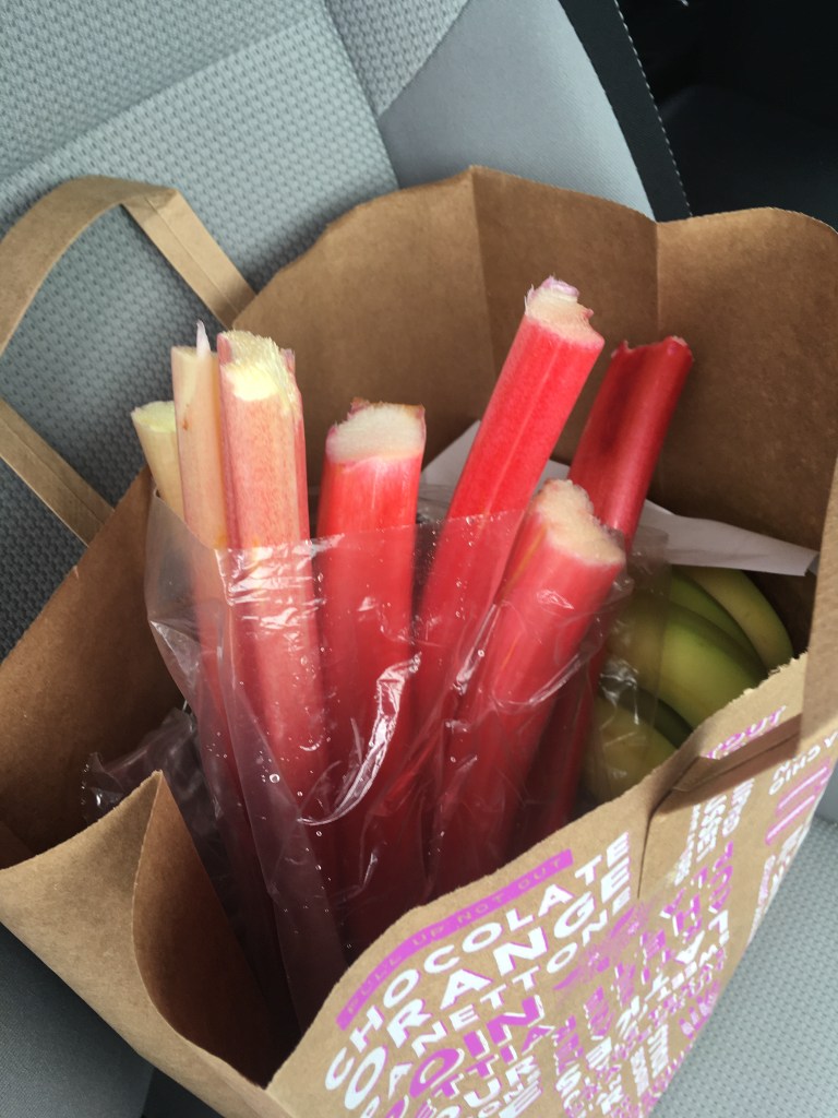 Ah….This was such a pleasing day at the grocer. I only bought were fresh vegetables and fruits. And an odd combo too: red cabbage, pomegranate, limes, rhubarb (obviously!), ginger root, fresh parsley, an orange, bananas and the little box of candied fruits. I feel so healthy (except for the candied fruits) and unapologetic, which is nice. It is a good time to be me.