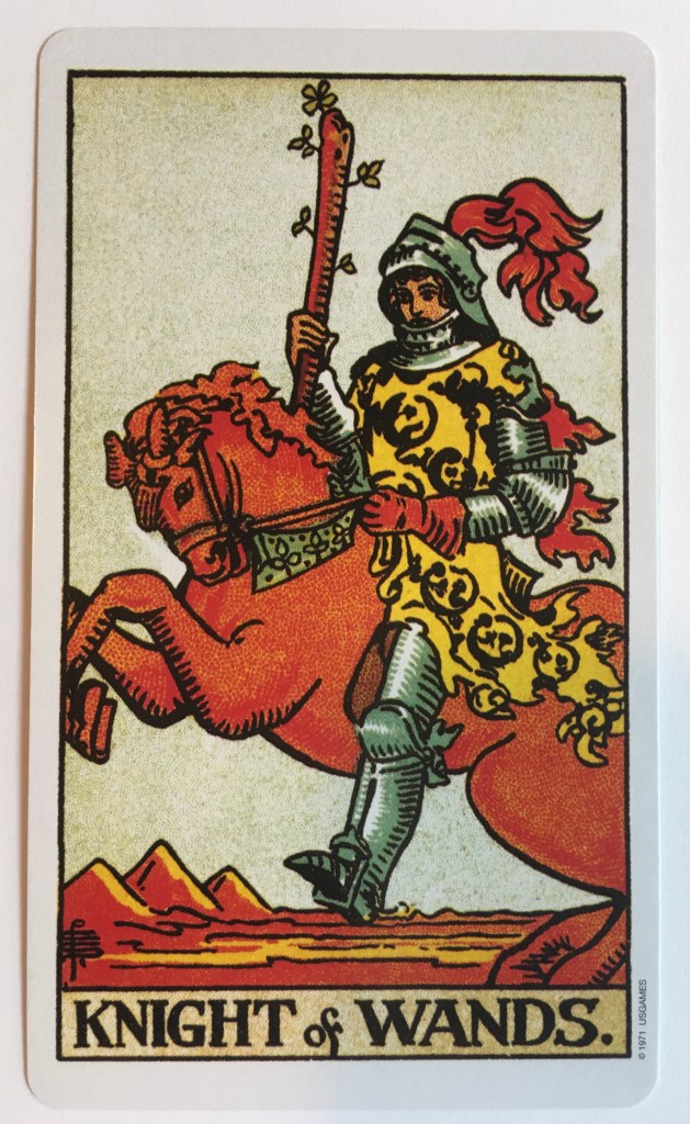 I was feeling anxious about an upcoming event where I knew I would be spending a lot of time with a group of people with whom I have a long and somewhat tumultuous history. I decided to do a reading for myself with the question, “How do I need to show up for this event?” You know what card turned up? Out of 78 possible cards? Yeah, you know it – the Knight of Wands. What did it say to me? Show up as YOURSELF.
