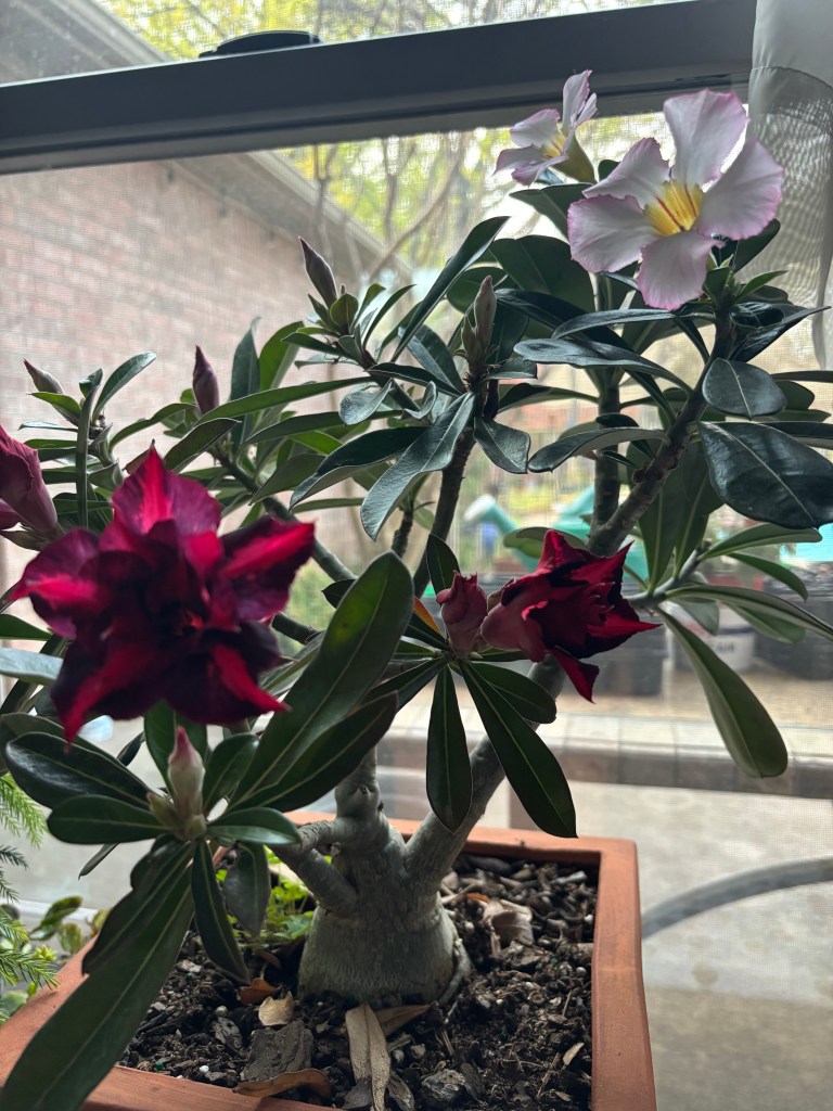Two years ago, I saw a Desert Rose in my local garden center and fell in love. It is such a funky plant, with a fat caudex (water-storing trunk) and beautiful, large, long-lasting flowers that bloom in both spring and fall (after resting during the hottest part of the summer). It is one of the few plants for me with the extra special designation: non-native plants that are so beloved that they are worth the trouble of bringing them inside for the winter and back outside for the summer.